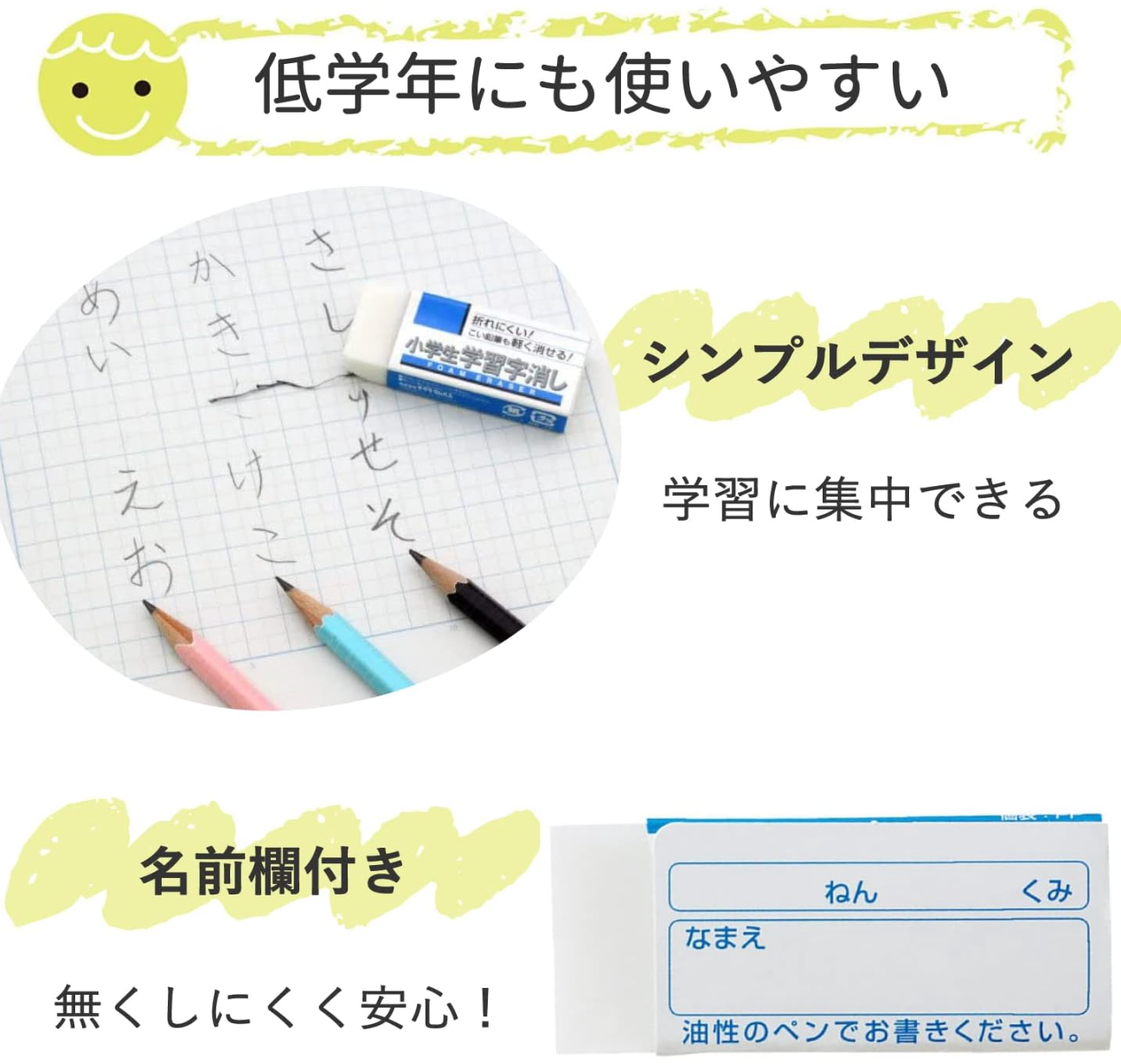 Product Benefits: Clean erasing, daily learning support