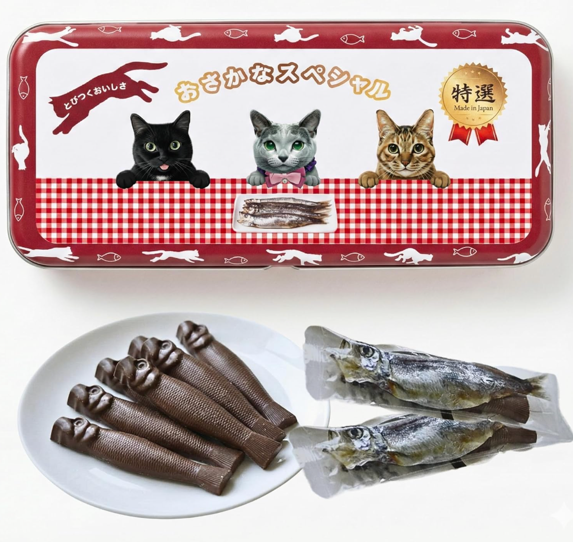 The Alneka Cat Tin is a charming gift for any cat lover. This set includes eight pieces of realistic fish-shaped chocolate inside a beautiful metal case. Each chocolate looks like a small fish, making it a fun surprise when you open the lid. The design brings a smile to your face and starts happy conversations. 🇯🇵 🐱