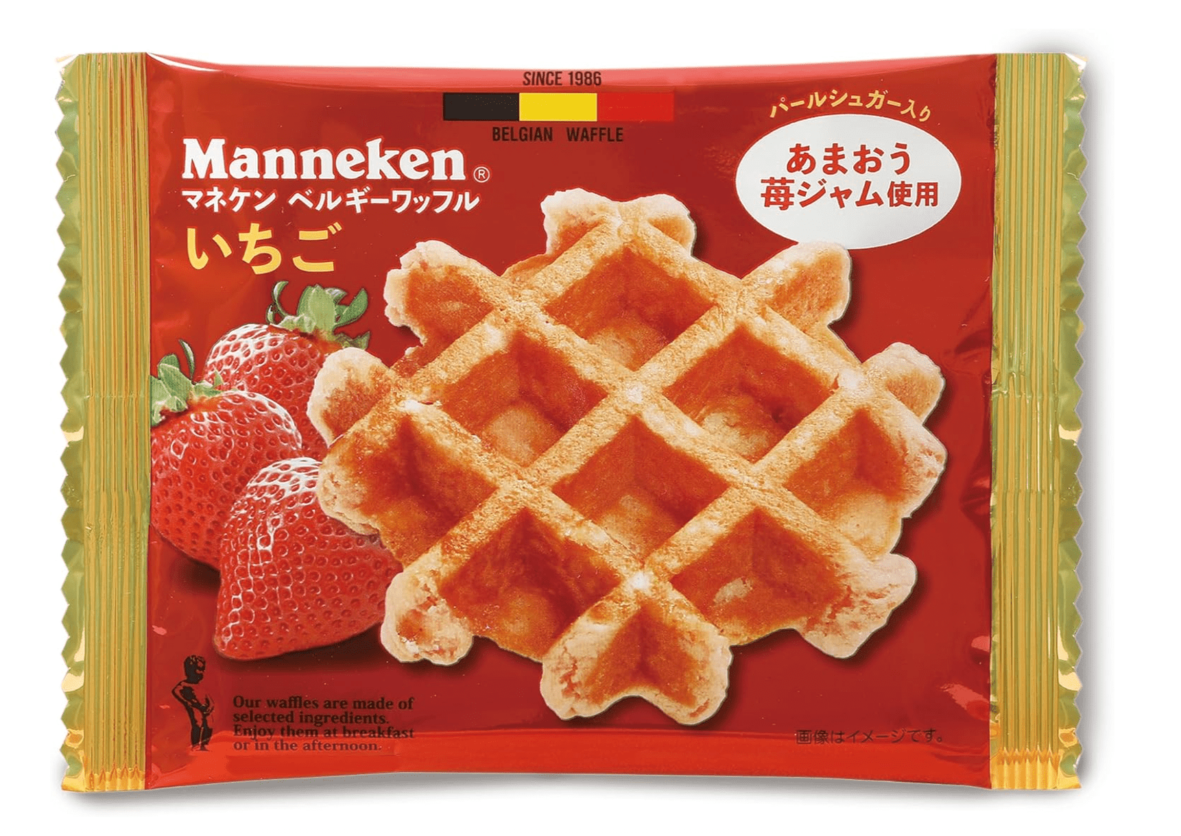The Manneken Belgian Strawberry Waffle pack is a delightful treat that combines the charm of Belgian baking with the sweet taste of strawberries.
